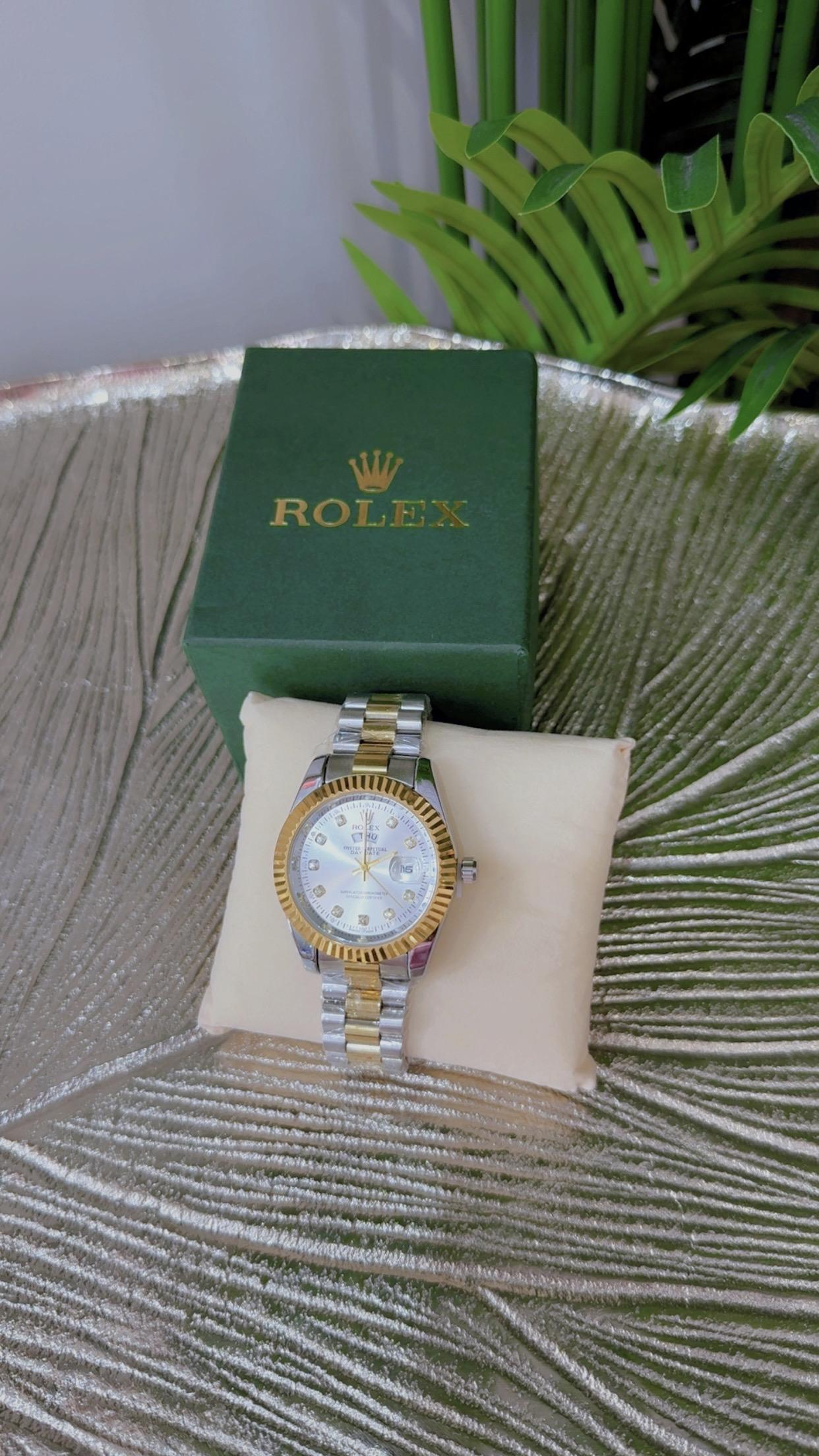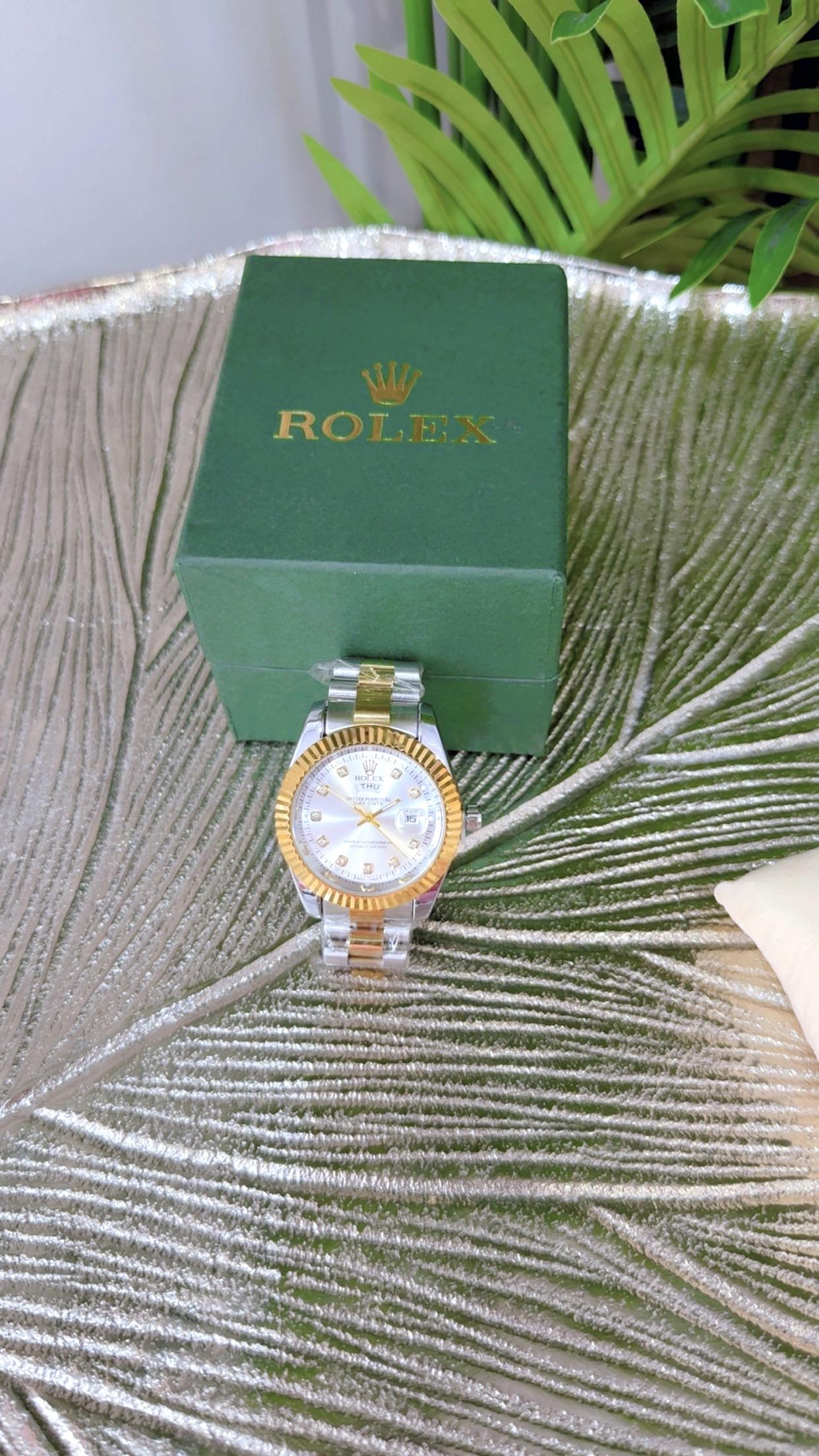 levate your style with this luxurious Men’s Rolex Watch, crafted in a stunning blend of gold and silver tones. Designed for the modern gentleman, this timepiece combines elegance, precision, and durability. Its sleek metal strap and classic dial make it perfect for both formal and casual occasions. Whether for business meetings or special events, this Rolex watch adds a bold statement of success and sophistication.
